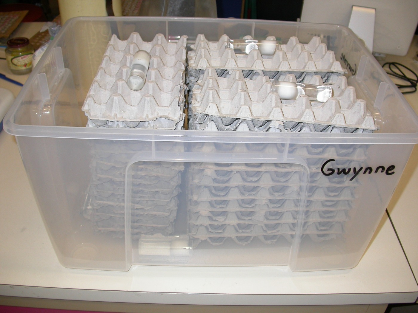 Figure 3: Rearing Bin filled with stacks of half egg trays.